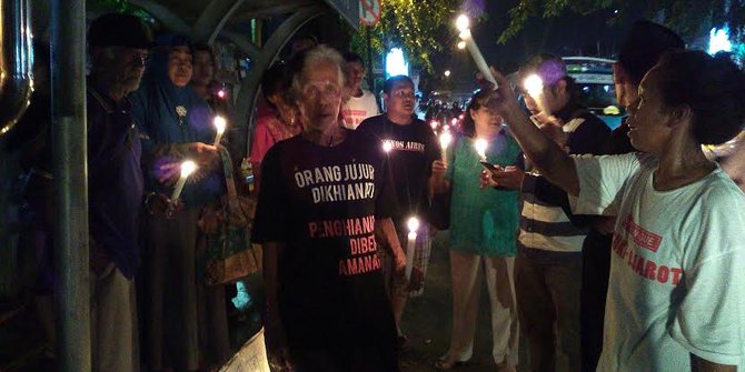 Hanya beralaskan spanduk bekas, mereka getol menyuarakan keadilan untuk Basuki T Purnama alias Ahok. Tak ada penerangan, hanya ada lilin yang masih menyala.